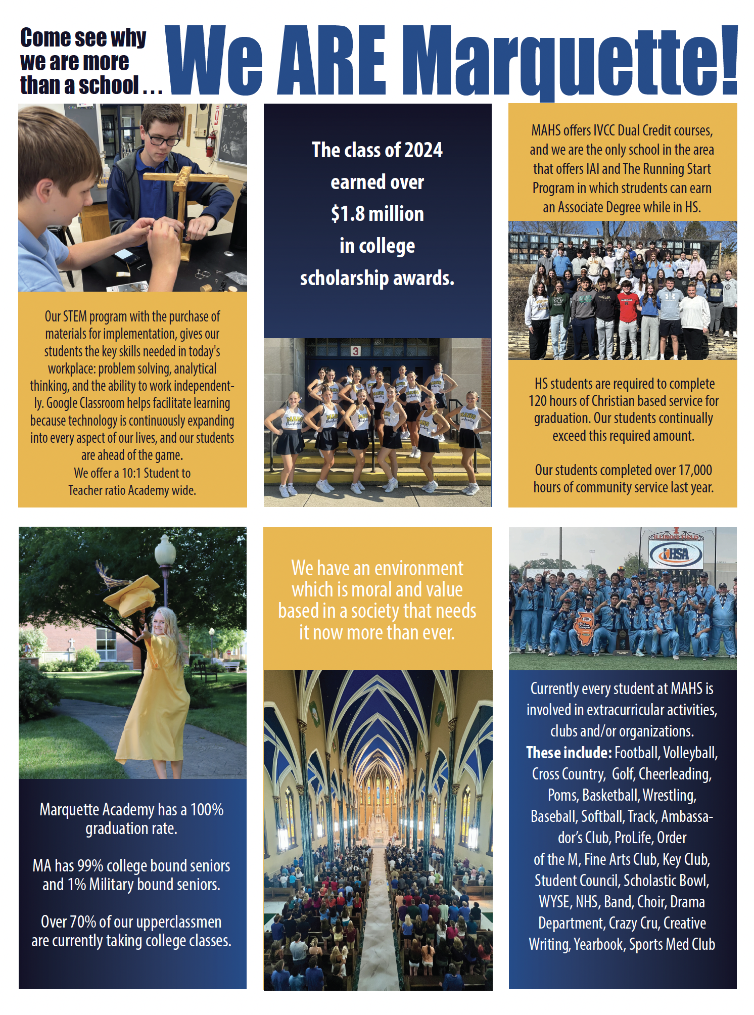 Marquette Academy is a Roman Catholic school community consisting of students, faculty, staff, parents and alumni under the direction of the Bishop of Peoria.